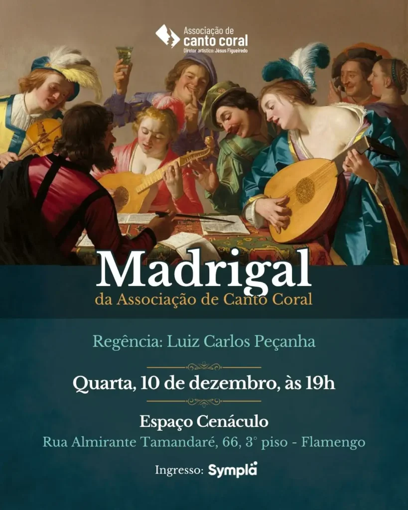 Na quarta, 10 de dezembro, às 19h, o Madrigal da ACC se apresentará no Espaço Cenáculo (Rua Almirante Tamandaré, 66, 3° piso – Flamengo – Rio de Janeiro).