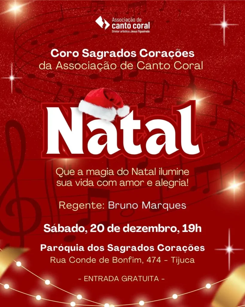 No Sábado, 20 de dezembro, às 19h, o Coro Sagrados Corações apresenta o concerto “Natal” na Paróquia dos Sagrados Corações (Rua Conde de Bonfim, 474 – Tijuca – Rio de Janeiro).